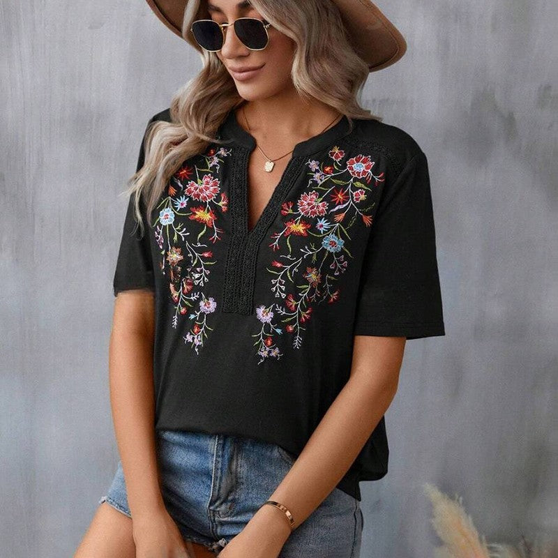 Details: • Material: 95% Polyester, 5% Elastane • Neckline: V-Neck • Sleeves: Short • Features: Floral Embroidery, Lace Trim • Sizes: S–XXL